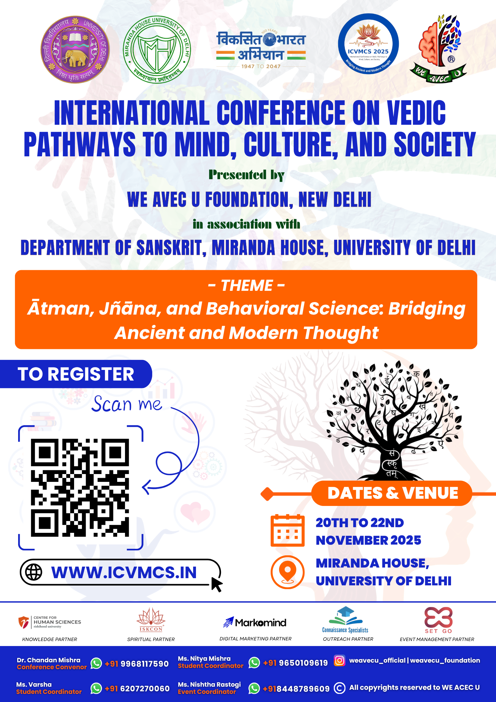 ICVMCS is an academic forum exploring the intersections of ancient Vedic knowledge and modern behavioural science. The conference fosters rigorous, evidence-based inquiry while engaging Indian Knowledge Systems (IKS) as a living, testable body of knowledge. Scholars across psychology, humanities, social sciences, philosophy, education, language and cultural studies co-create verifiable, contextually grounded insights.