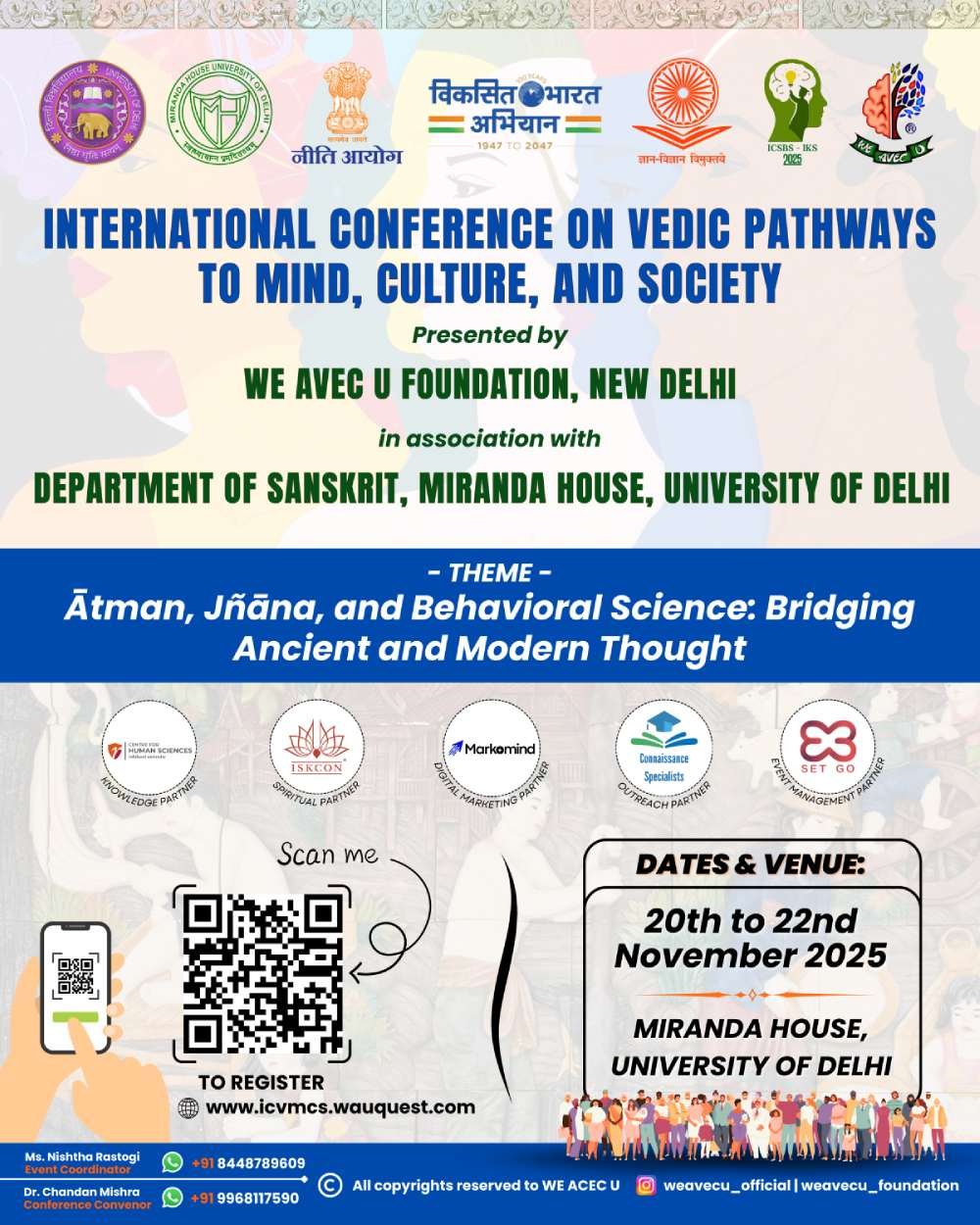 Miranda House, University of Delhi, is a premier institution renowned for its excellence in humanities, social sciences, and interdisciplinary research, making it an ideal venue for the International Conference on Vedic Pathways to Mind, Culture, and Society (ICVPMC 2025). Its Department of Sanskrit has significantly contributed to textual scholarship, translation, and classical hermeneutics, bridging ancient wisdom with contemporary inquiry. The college fosters interdisciplinary dialogue connecting philosophy, culture, and behavioral sciences, aligning perfectly with the conference’s themes of Ātman, Jñāna, and Vedic-informed approaches to well-being and society. With a legacy of community engagement, cultural preservation, and inclusive education, Miranda House provides a vibrant academic ecosystem for scholars, educators, and practitioners to explore the intersections of Indian Knowledge Systems and modern behavioral science.